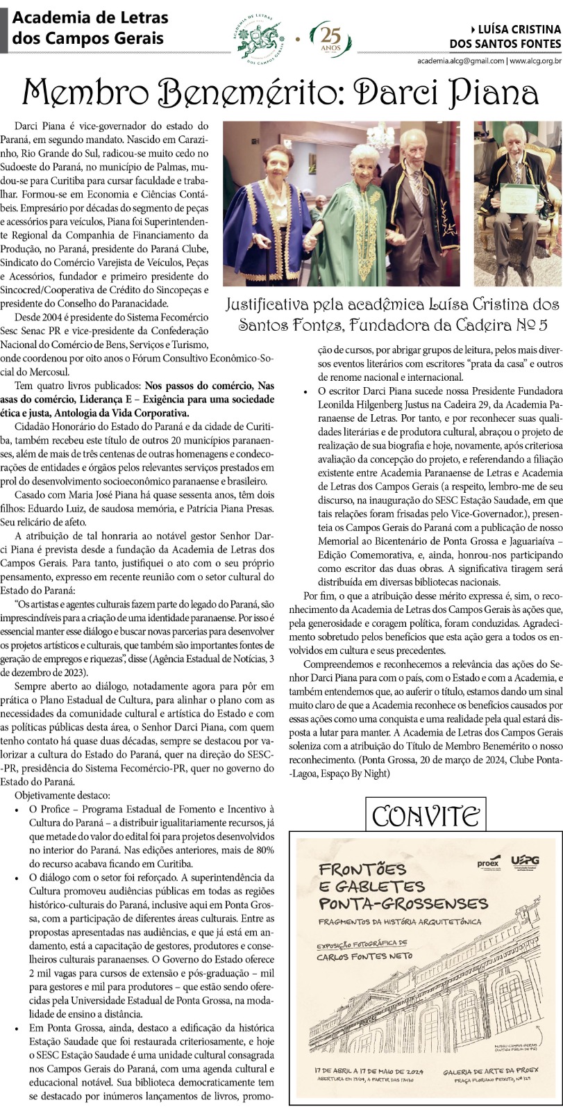 A atribuição de tal honraria ao notável gestor Senhor Darci Piana é prevista desde a fundação da Academia de Letras dos Campos Gerais. Para tanto, justifiquei o ato com o seu próprio pensamento, expresso em recente reunião com o setor cultural do Estado do Paraná: