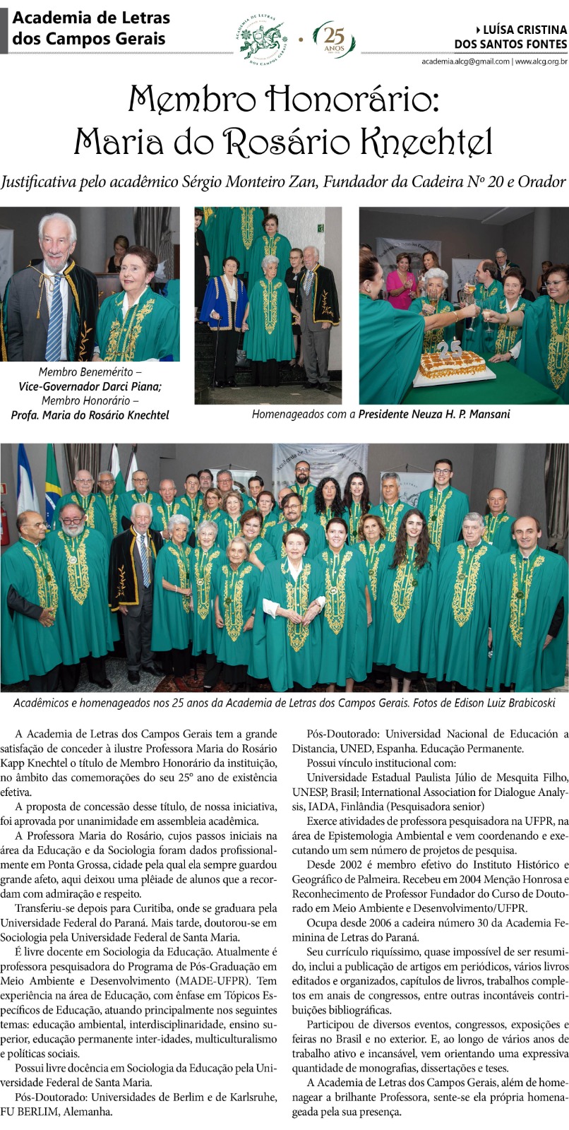 A Academia de Letras dos Campos Gerais tem a grande satisfação de conceder à ilustre Professora Maria do Rosário Kapp Knechtel o título de Membro Honorário da instituição, no âmbito das comemorações do seu 25° ano de existência efetiva.