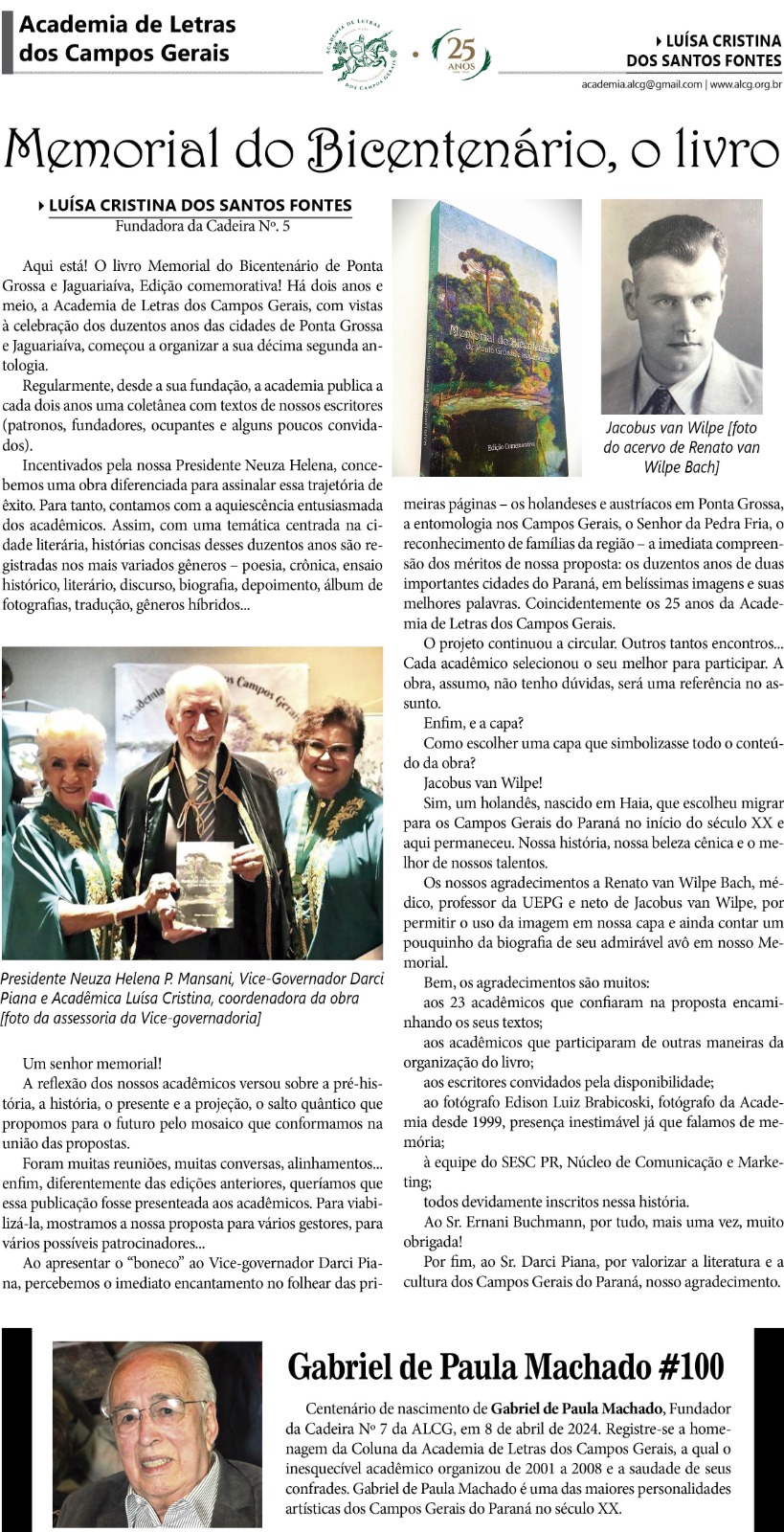 Por fim, ao Sr. Darci Piana, por valorizar a literatura e a cultura dos Campos Gerais do Paraná, nosso agradecimento.