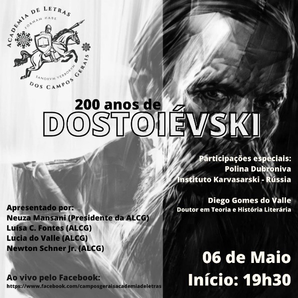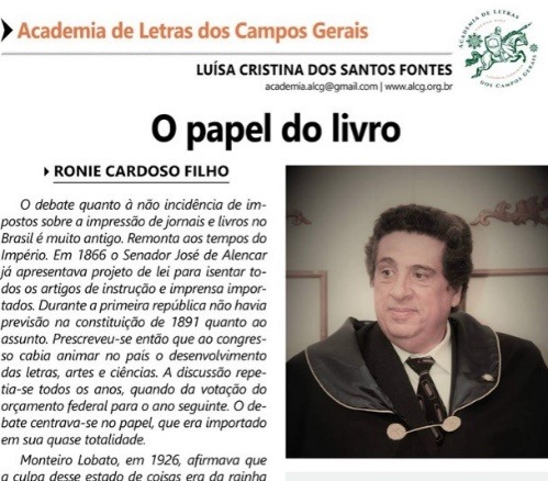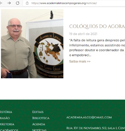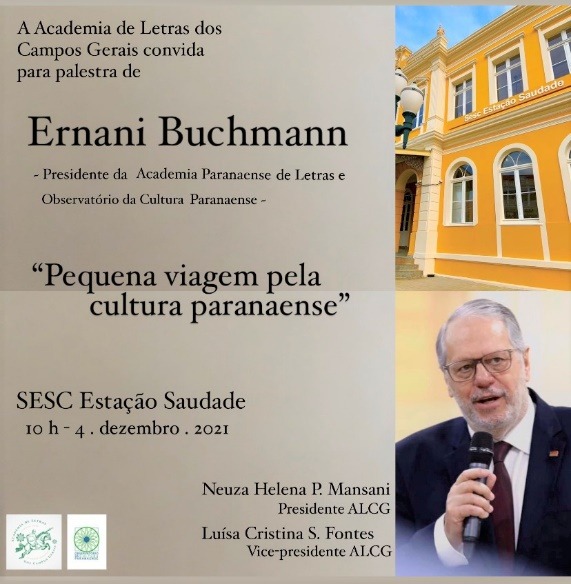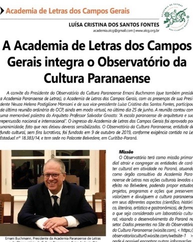 Entre as iniciativas inovadoras, há de se destacar eventos como Colóquios do Agora, Webinários (Dostoiévski e Literatura Norueguesa), Saraus Virtuais e o lançamento do site da Academia, além de atividades extras e regulares constantes da programação anual (O escritor e sua obra e o Projeto Crônicas dos Campos Gerais). A presença da Academia também se nota em promoções artístico-culturais e alusivas a efemérides, a exemplo da sessão solene comemorativa aos 85 anos da Academia Paranaense de Letras, oportunidade em que Neuza Helena e Luísa Cristina dos Santos Fontes (vice da ALCG) se fizeram presentes também como integrantes do Observatório da Cultura Paranaense. [Excerto de Revista D´Ponta, n. 287. Seleção de fotos de algumas das múltiplas atividades por Luísa Cristina S. Fontes.]